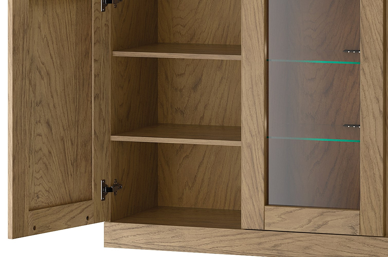 Fabriqué à partir de la face avant : Bois de chêne massif ; éléments de panneau plaqués en chêne naturel à chevrons ; verre trempé fumé.