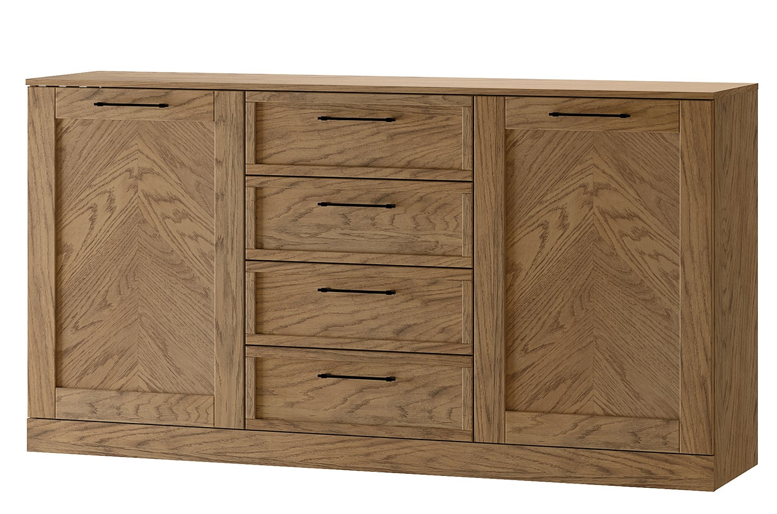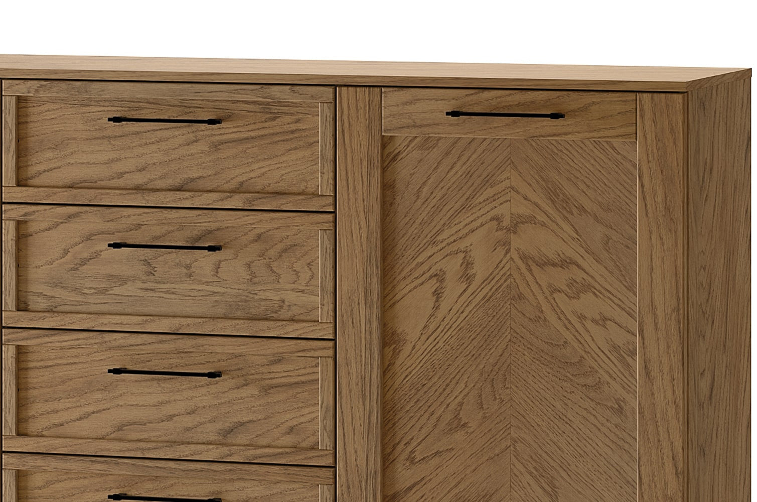 La commode COZY 47 allie la force du design contemporain à la chaleur naturelle du chêne. Sa façade à chevrons, caractéristique de la collection, ajoute de la texture et du mouvement, tandis que les poignées en métal noir apportent un contraste moderne et sophistiqué.
