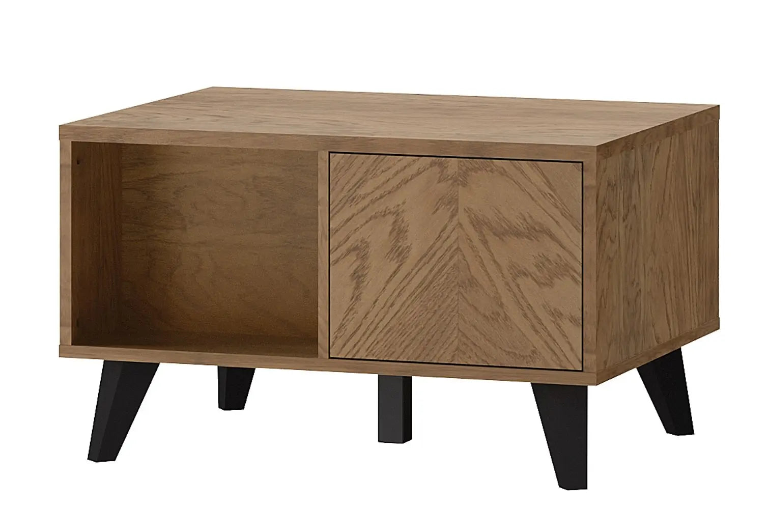 Il dispose d'un tiroir à fermeture progressive et d'un compartiment ouvert, idéal pour ranger des magazines, des télécommandes ou de petits objets décoratifs. Les pieds en bois massif noir renforcent le contraste visuel et lui confèrent stabilité et style contemporain.
