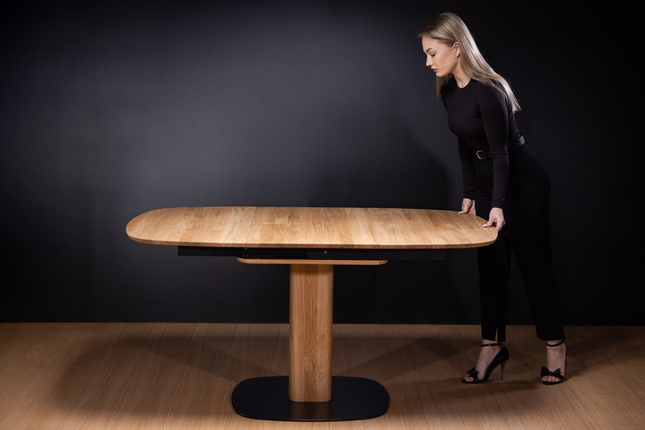 Conçue à partir de matériaux de haute qualité, la table Luna de Karpis, avec son piètement central, allie élégance et fonctionnalité, même dans les espaces les plus compacts. Son plateau extensible intègre un mécanisme discret qui permet d'agrandir facilement la surface grâce à une rallonge parfaitement intégrée. Luna est le fruit d'une combinaison harmonieuse entre l'acier noir et le bois chaleureux, rehaussée par des formes superelliptiques résolument modernes. La solution idéale pour les intérieurs contemporains.