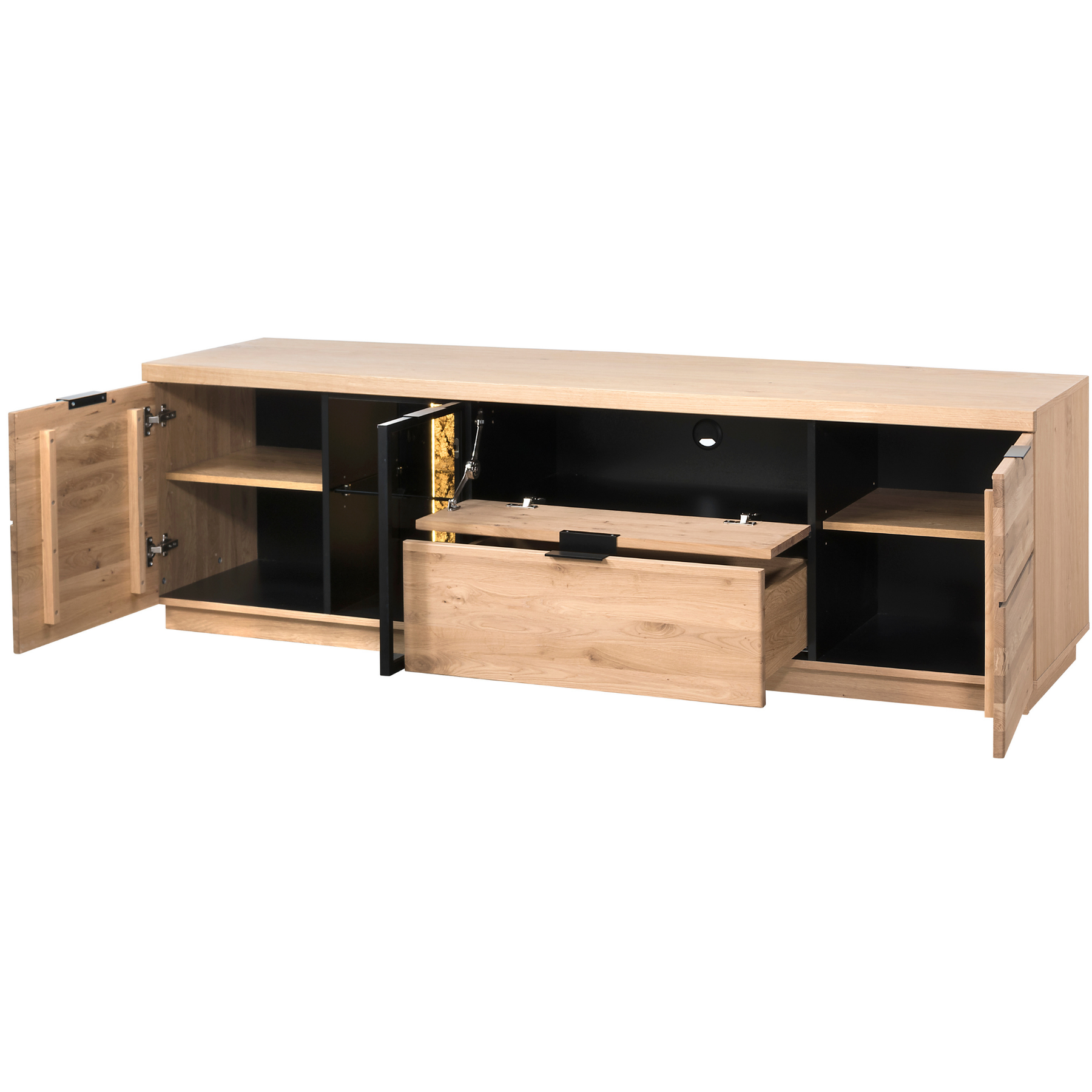 Sa structure large et robuste offre de multiples compartiments : des portes latérales avec étagères réglables, des tiroirs de grande capacité avec fermeture en douceur et un module central avec vitrine pour exposer des objets de décoration ou des appareils multimédias. Grâce à son design bas et allongé, il est parfait pour accueillir des téléviseurs de grande taille, tout en conservant un équilibre visuel moderne et ordonné.