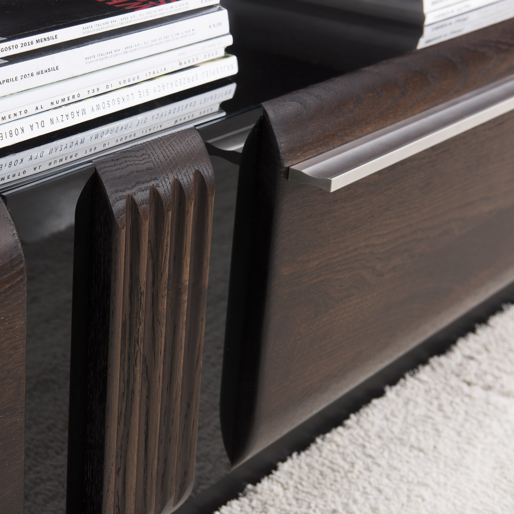 Le meuble TV PORTI 25 allie le design, la fonctionnalité et une esthétique sophistiquée qui met en valeur tout salon. Sa façade est en chêne massif, accompagnée de détails en verre trempé noir et de moulures striées caractéristiques de la collection PORTI, qui apportent texture et profondeur visuelle.