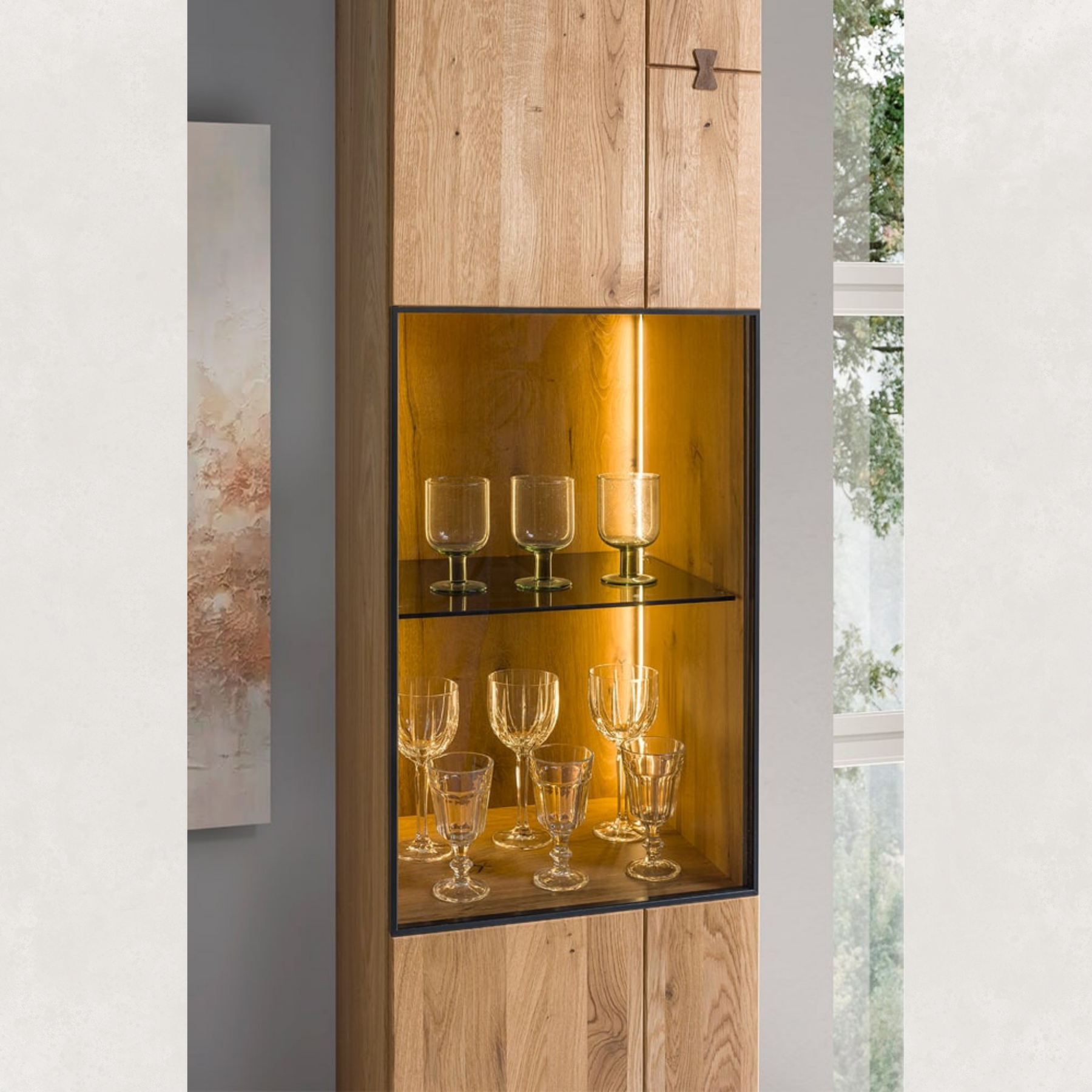 Le contraste entre le bois naturel et le cadre de couleur anthracite ajoute une touche contemporaine, et l'éclairage LED intégré éclaire les objets intérieurs d'une lumière blanche et chaude qui crée une atmosphère chaleureuse.